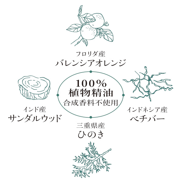 バレンシアオレンジ、サンダルウッド(白檀)、ヒノキ、ベチパーの100%植物精油が使用されています。