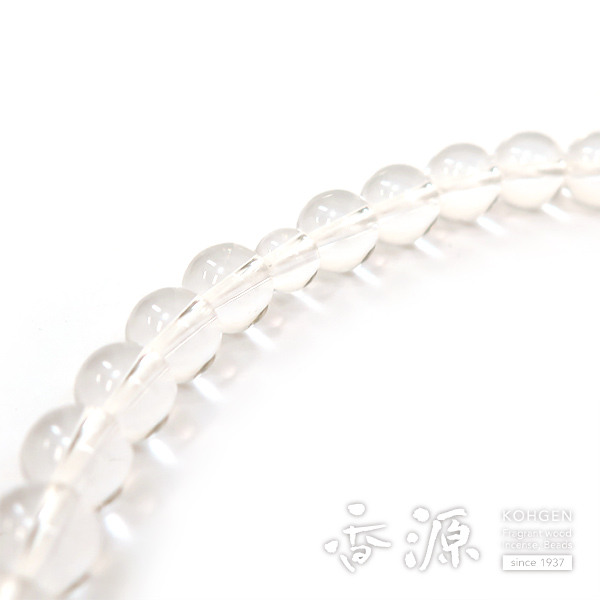 この数珠は、水晶がオーソドックスな丸い形に仕立てられ、清潔で穏やかな雰囲気を出すよう形作られています。